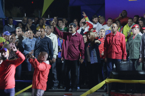 资料图片:5月20日,在委内瑞拉加拉加斯,现任总统马杜罗(中)出席集会。新华社发