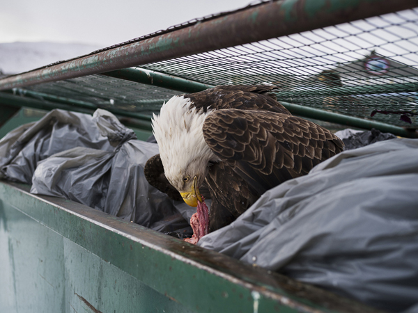 2017年2月14日美国阿拉斯加州荷兰港,一只秃鹰在超市的垃圾箱吃肉碎。