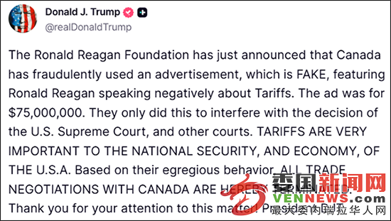 特朗普:美国即刻终止与加拿大所有贸易谈判
